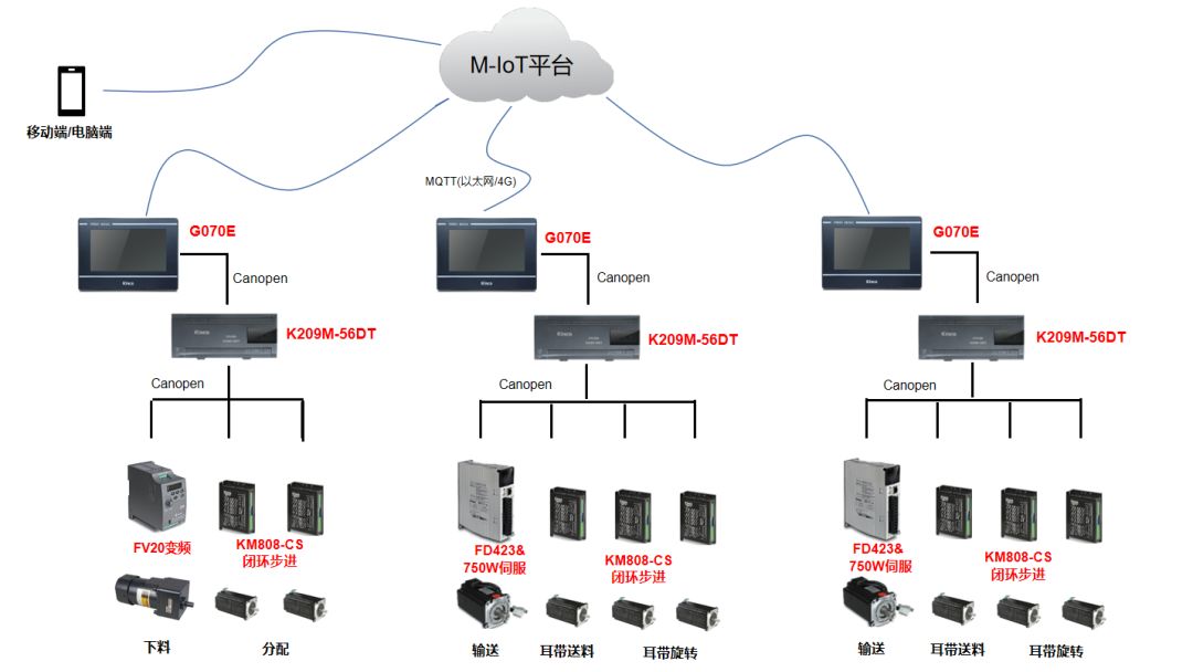 客戶和設(shè)備商擔(dān)心的就是設(shè)備故障停機,升級版口罩機Plus方案通過互聯(lián)網(wǎng)或4G將整套設(shè)備接入云端的M-IoT平臺,讓設(shè)備上云,足不出戶就可實現(xiàn)設(shè)備遠(yuǎn)程診斷,實現(xiàn)故障及時排查與預(yù)防性維護(hù)。通過對驅(qū)動器、電機、變頻器、PLC、HMI的運行數(shù)據(jù)采集,完成對設(shè)備運行健康狀態(tài)的監(jiān)控。