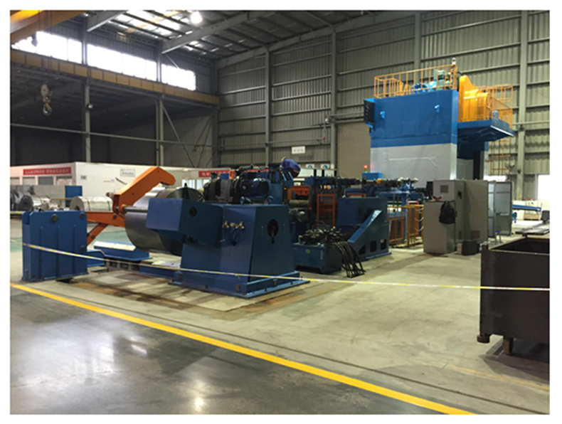 廣州市漢達(dá)五金機(jī)械有限公司的鋼板下料生產(chǎn)線,用于將整卷鋼材通過(guò)上料、開(kāi)卷、入料、整平、NC 定尺送料、廢料處理、沖壓等一序列工序,加工成工廠所需的鋼板尺寸和形狀。