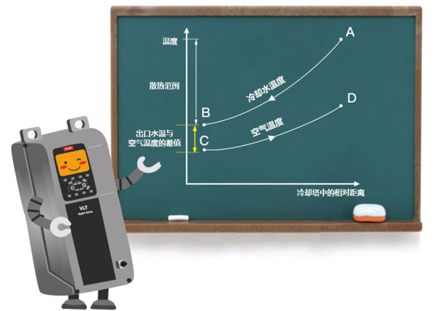 剛才提到散熱效率,那究竟該如何衡量冷卻塔散熱效果呢?教給大家一個(gè)獨(dú)家秘笈,大家快看下黑板中的曲線吧~