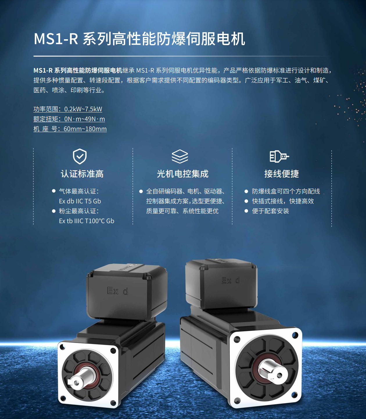 MS1-R系列防爆電機(jī)是匯川技術(shù)研制的最新一代防爆電機(jī)產(chǎn)品,功率范圍0.2kW~1.8kW,機(jī)座號(hào) 60mm~130mm,提供多種慣量配置、轉(zhuǎn)速段配置,可根據(jù)客戶需求提供不同配置的編碼器類型。適用于特種裝備,包裝,醫(yī)藥等行業(yè),實(shí)現(xiàn)快速精確的位置控制、速度控制、轉(zhuǎn)矩控制和軌跡控制。