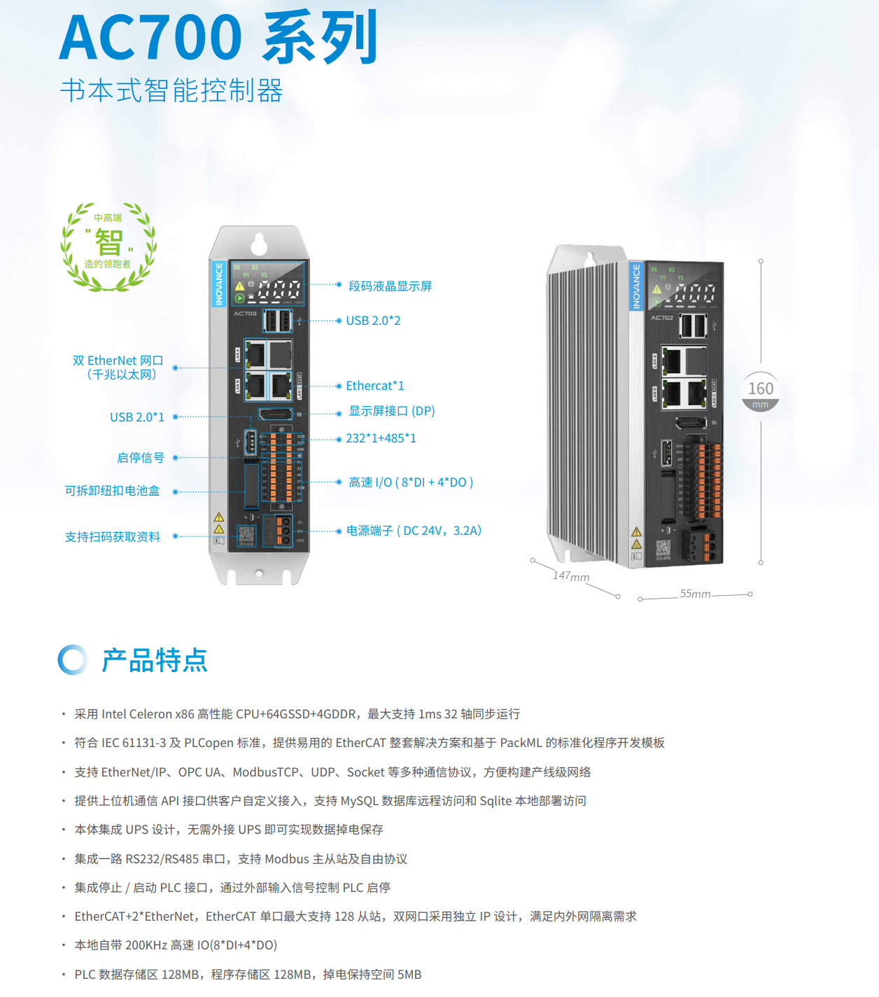 AC700系列書本式智能機(jī)械控制器,是基于Intel X86處理器硬件平臺(tái),符合PLCopen規(guī)范和IEC-61131-3標(biāo)準(zhǔn)的高性能運(yùn)動(dòng)控制器,支持ST,LD,SFC,CFC編程語(yǔ)言。標(biāo)配EtherCAT工業(yè)以太網(wǎng)實(shí)時(shí)總線,可以實(shí)現(xiàn)最大32軸同步控制。全系配置兩路千兆以太網(wǎng)口,支持EtherNet/IP與OPC UA等主流通訊協(xié)議,可以輕松的實(shí)現(xiàn)生產(chǎn)現(xiàn)場(chǎng)與IT系統(tǒng)的數(shù)據(jù)交互。同時(shí),AC700本體集成UPS(不間斷電源),即無(wú)需外接UPS即可實(shí)現(xiàn)數(shù)據(jù)掉電保存。匯川在工業(yè)自動(dòng)化領(lǐng)域超過(guò)7年的軟件平臺(tái)深度迭代開發(fā)與工藝算法庫(kù)積累,使其可以簡(jiǎn)單、高效、穩(wěn)定的搭建設(shè)備應(yīng)用程序,尤其在高速、高精、高性能需求的大規(guī)模過(guò)程自動(dòng)化、產(chǎn)線自動(dòng)化和工廠自動(dòng)化智能制造領(lǐng)域十分適用。